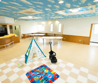 幼児英語教室や土日祝日の一時預かりで使用するスペースです。プレイマットやローテーブルを設置し、安全性にも配慮しています。幼児英語教室では、英語環境の中で遊びや歌、ダンス、公園活動などを行いながら楽しく英語に触れます。一時預かりは2時間から可能で、保育士が常駐し、安心してお子さまをお預けいただけます。